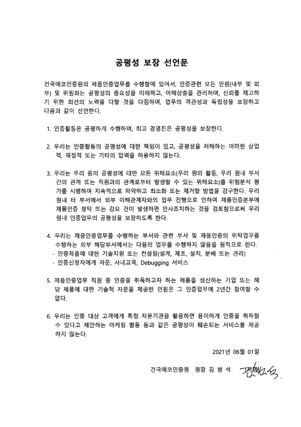 건국에코인증원의 인증업무를 수행함에 있어서, 인증관련 모든 인원(내부 및 외부) 및 위원회는 공평성의 중요성을 이해하고, 이해상충을 관리하며, 신뢰를 제고하기 위한 최선의 노력을 다할 것을 다짐하며, 업무의 객관성과 독립성을 보장하고 다음과 같이 선언한다.
